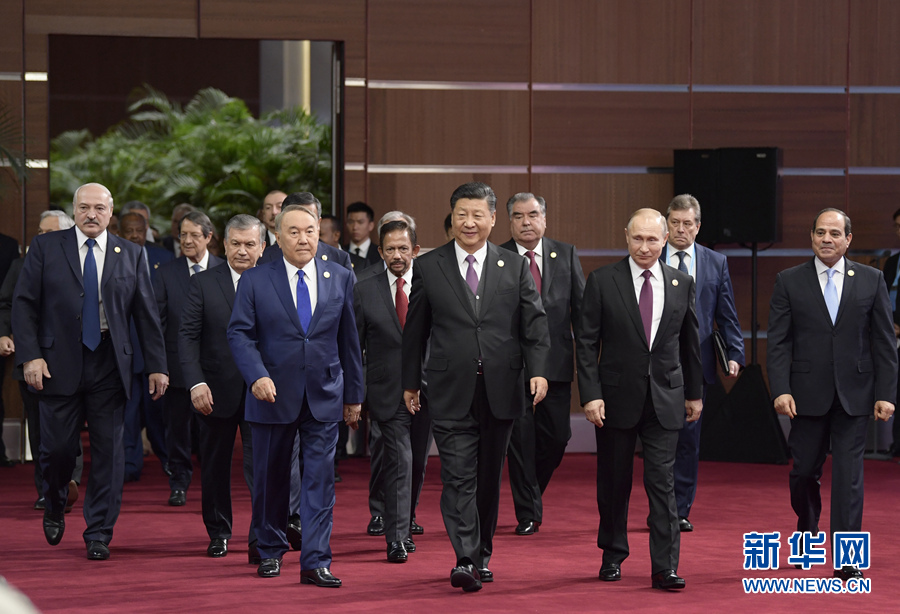这是习近平和出席开幕式的外方领导人共同步入会场。 新华社记者李学仁摄